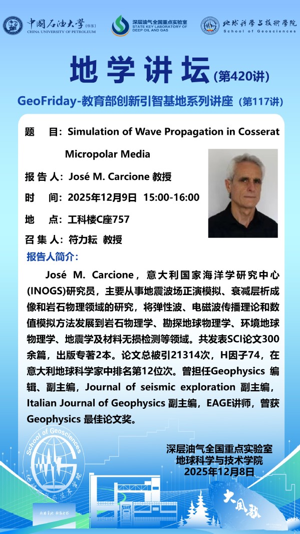 【地学讲坛第420讲】关于José M. Carcione 教授《Simulation of Wave Propagation in Cosserat Micropolar Media》学术报告的通知