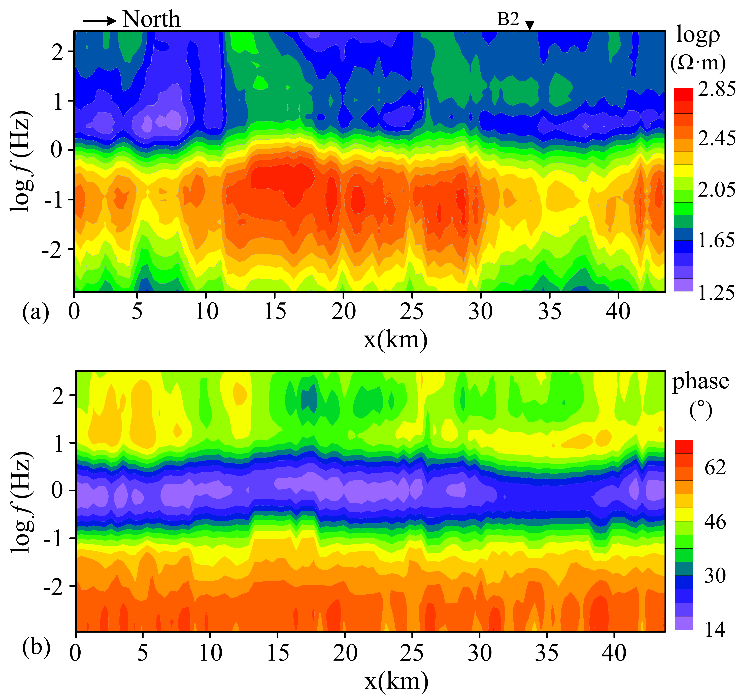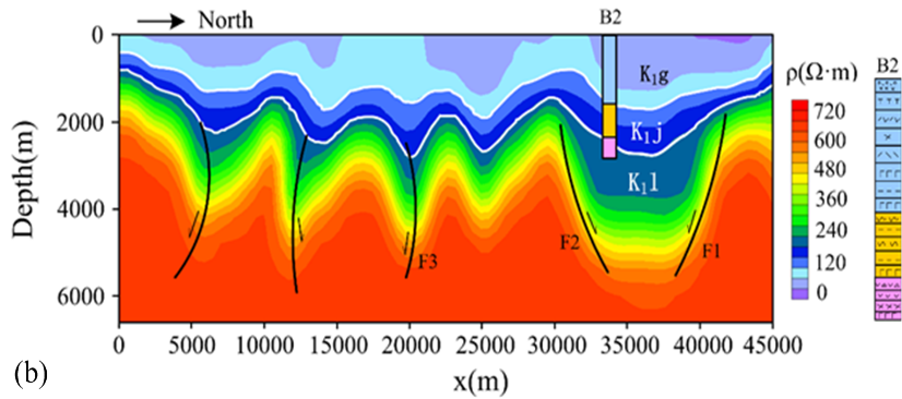 图2. 实测数据的反演结果。(a)观测视电阻率数据。(b)实测数据反演结果