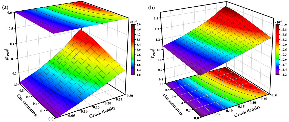 图1. 10kHz时垂直裂缝入射P波反射(a)和透射系数(b)与裂缝密度和气体饱和度参数的关系