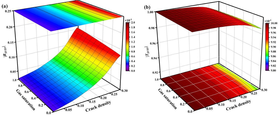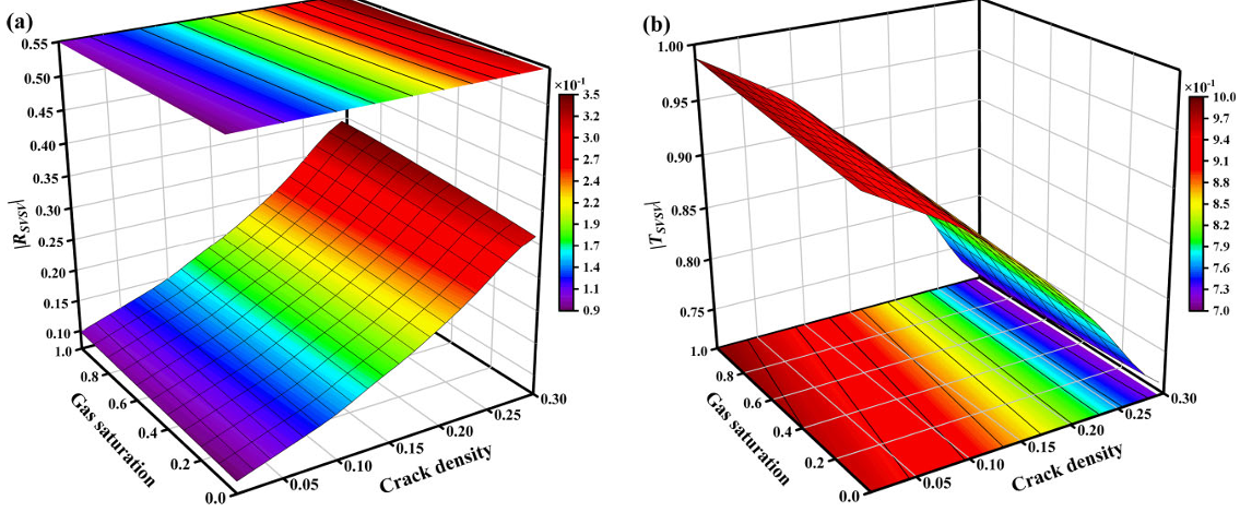 图4. 50Hz时垂直入射SV波反射(a)和透射系数(b)与裂缝密度和气体饱和度参数的关系