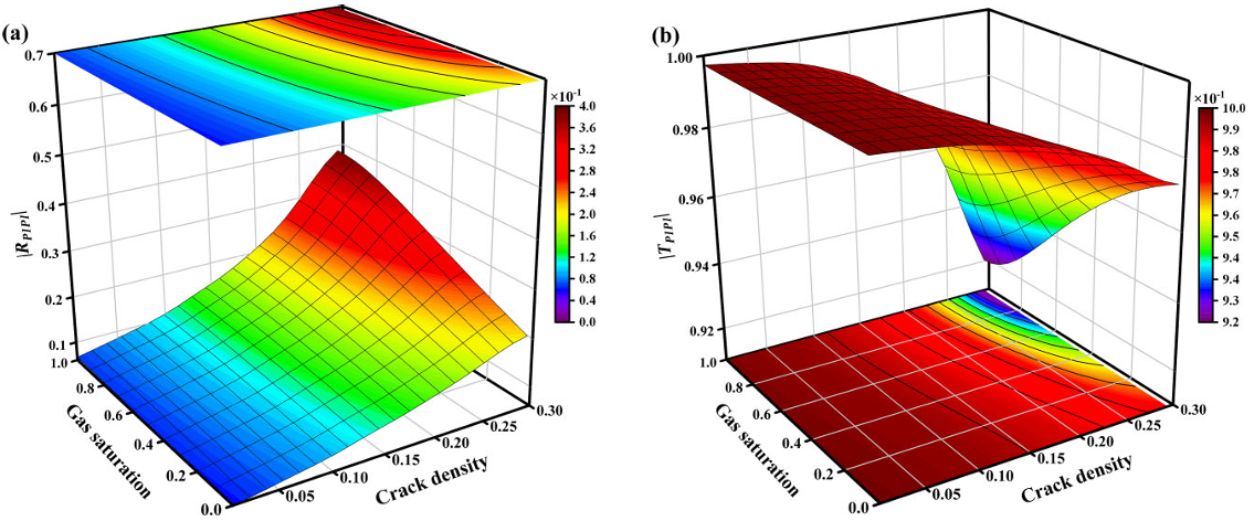 图3. 50Hz时垂直入射P波反射(a)和透射系数(b)与裂缝密度和气体饱和度参数的关系