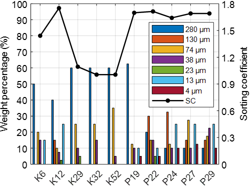 图1. 各人造砂岩样本中,不同直径(单位:微米)砂粒在整个样本中的重量百分比以及计算得出的分选系数(SC)