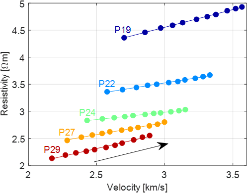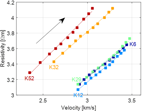 图3. 孔隙度相同样品压力依赖弹性-电性相关性。正方形代表实验数据,直线为与实验室结果最佳拟合的线性相关曲线,所有样本的相关系数均大于0.99。箭头指示方向代表围压增大的方向