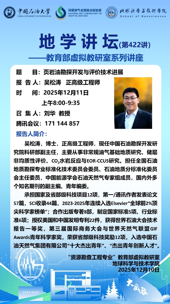 【地学讲坛第422讲】教育部虚拟教研室活动-关于吴松涛 正高级工程师《页岩油勘探开发与评价技术进展》讲座的通知