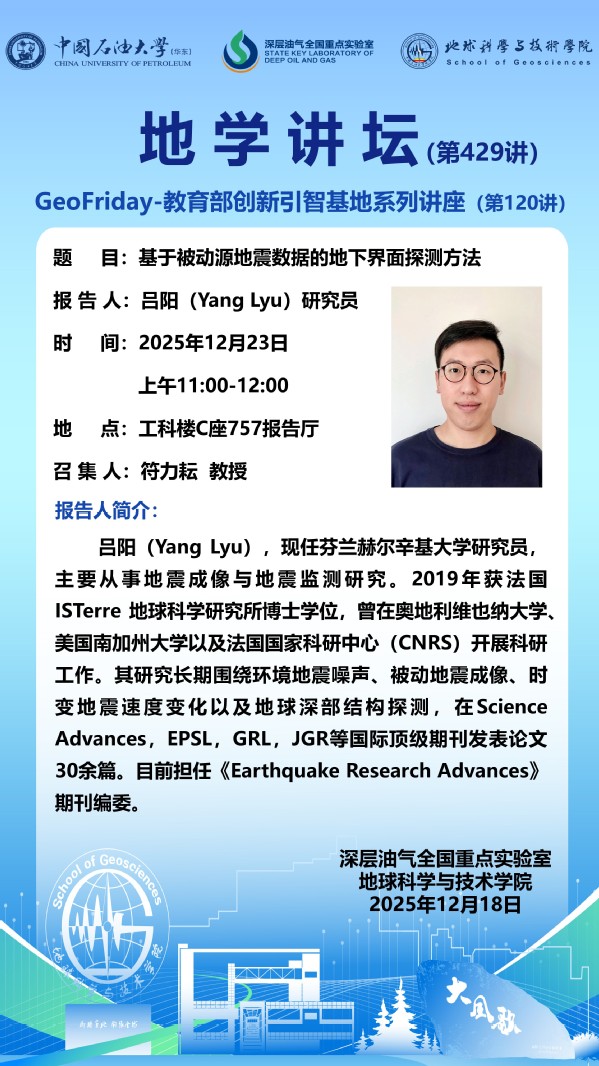 【地学讲坛第429讲】关于吕阳研究员研究员《基于被动源地震数据的地下界面探测方法》学术报告的通知