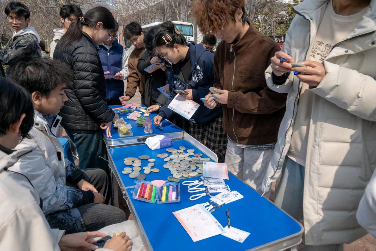 岩石彩绘工坊活动部分则为员工们提供了释放创意的舞台。参与者以天然石块为画布,以颜料为媒介,将春日生机与地质元素巧妙融合。一块块质朴的岩石,在大家精心创作下,变成了承载着员工们美好期许的“岩石思美文创”,成为独属于自己的春日纪念。不少同学选择与同伴协作创作,现场欢声笑语不断。这些精美的艺术作品不仅展现了员工们的艺术潜能,也让地质之美以更鲜活的方式走进校园生活。